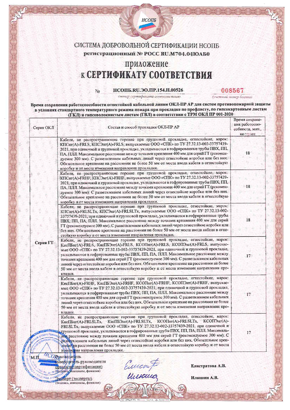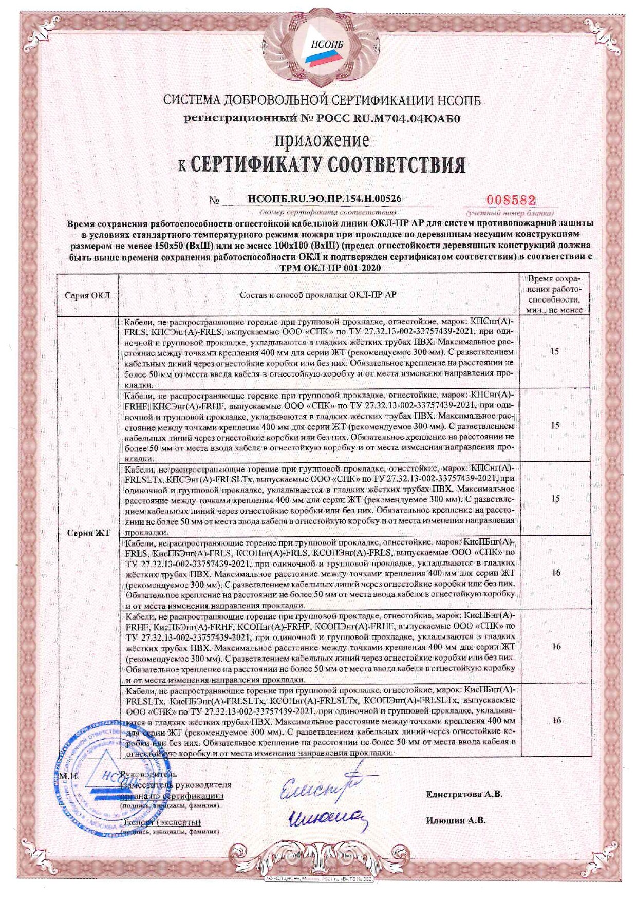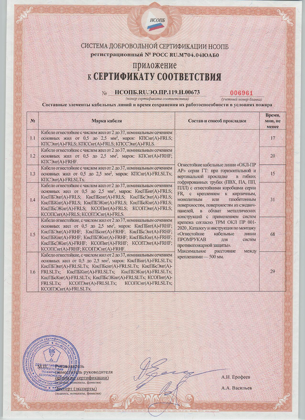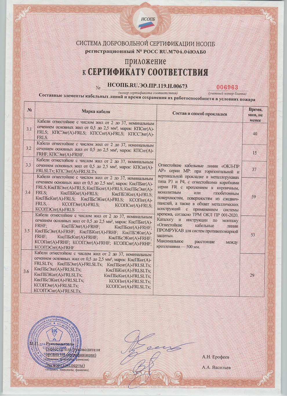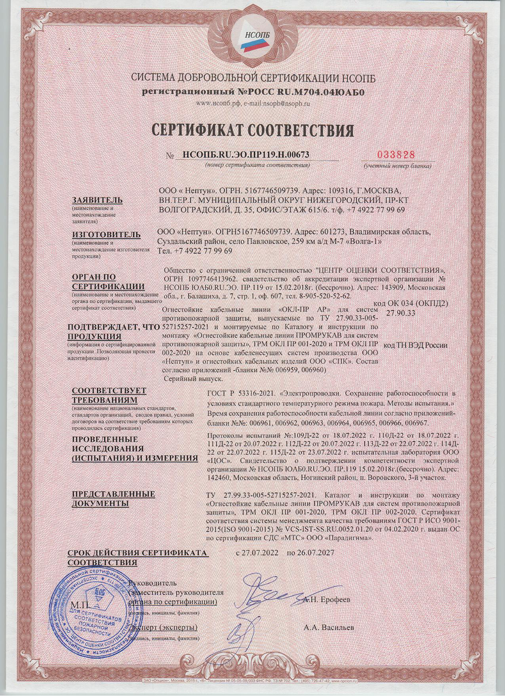 Время работоспособности ОКЛ-ПР АР подтверждается сертификатами соответствия, в соответствии с ГОСТ Р 53316-2009 «Кабельные линии. Сохранение работоспособности в условиях пожара. Методы испытания».