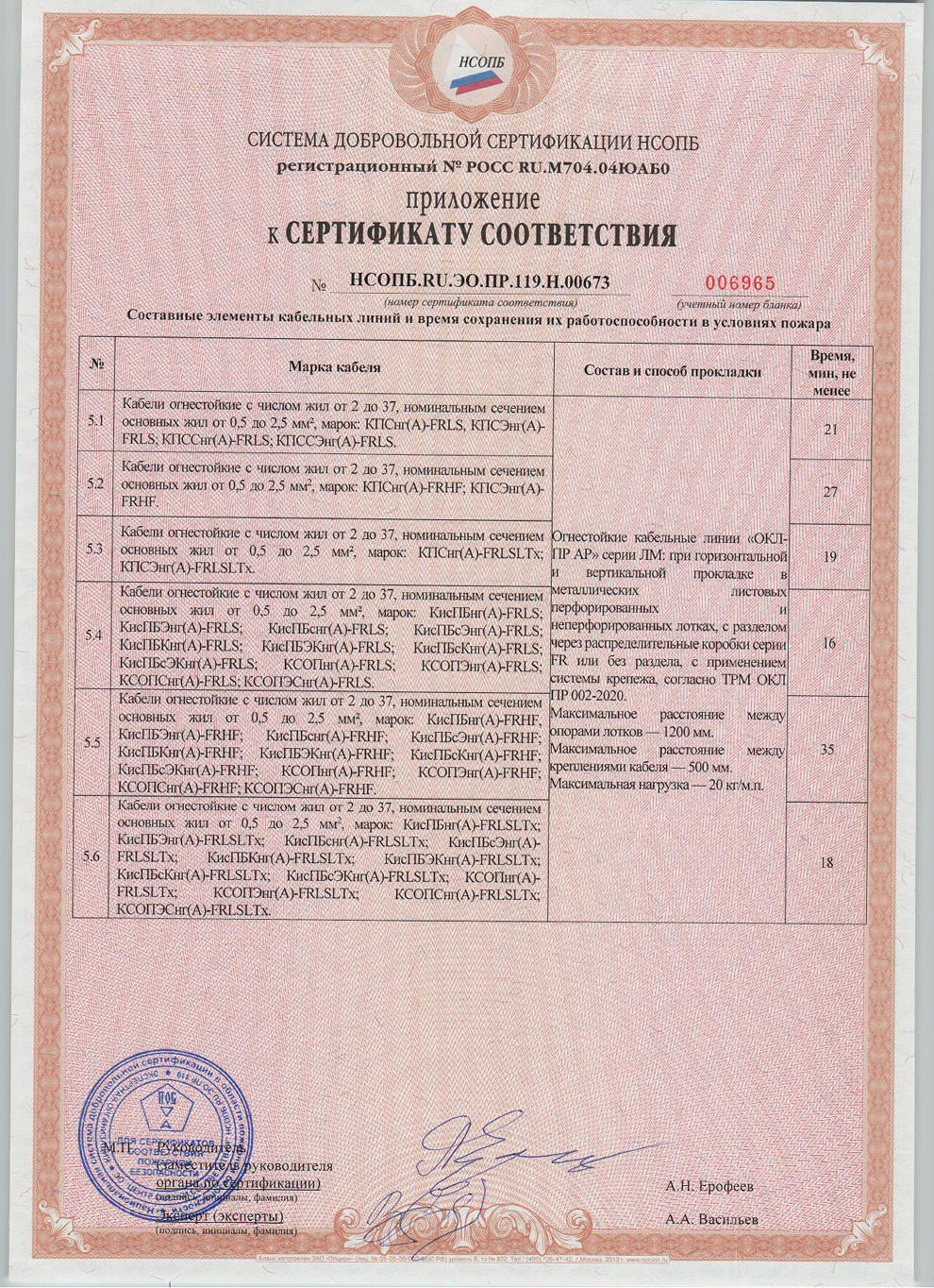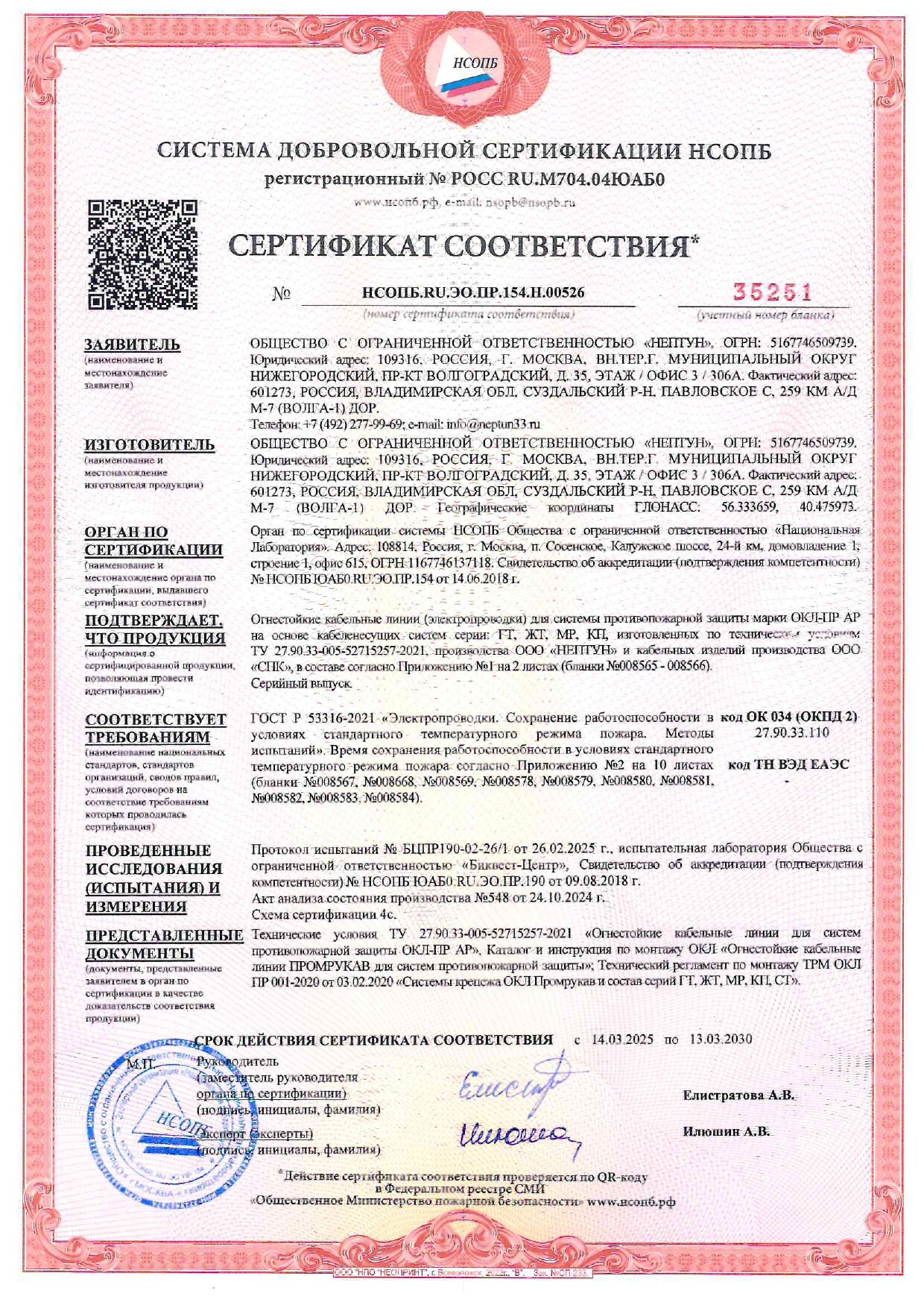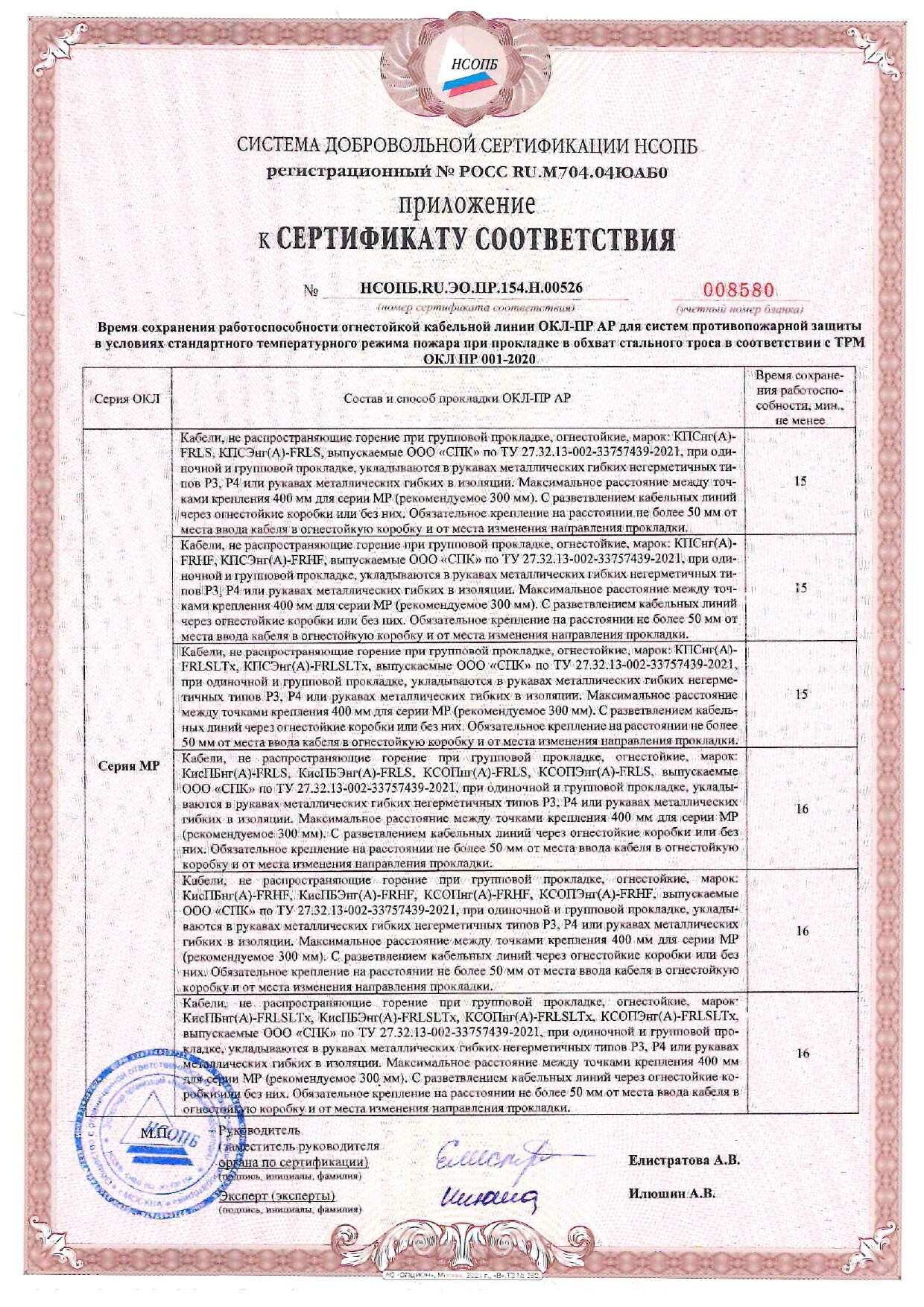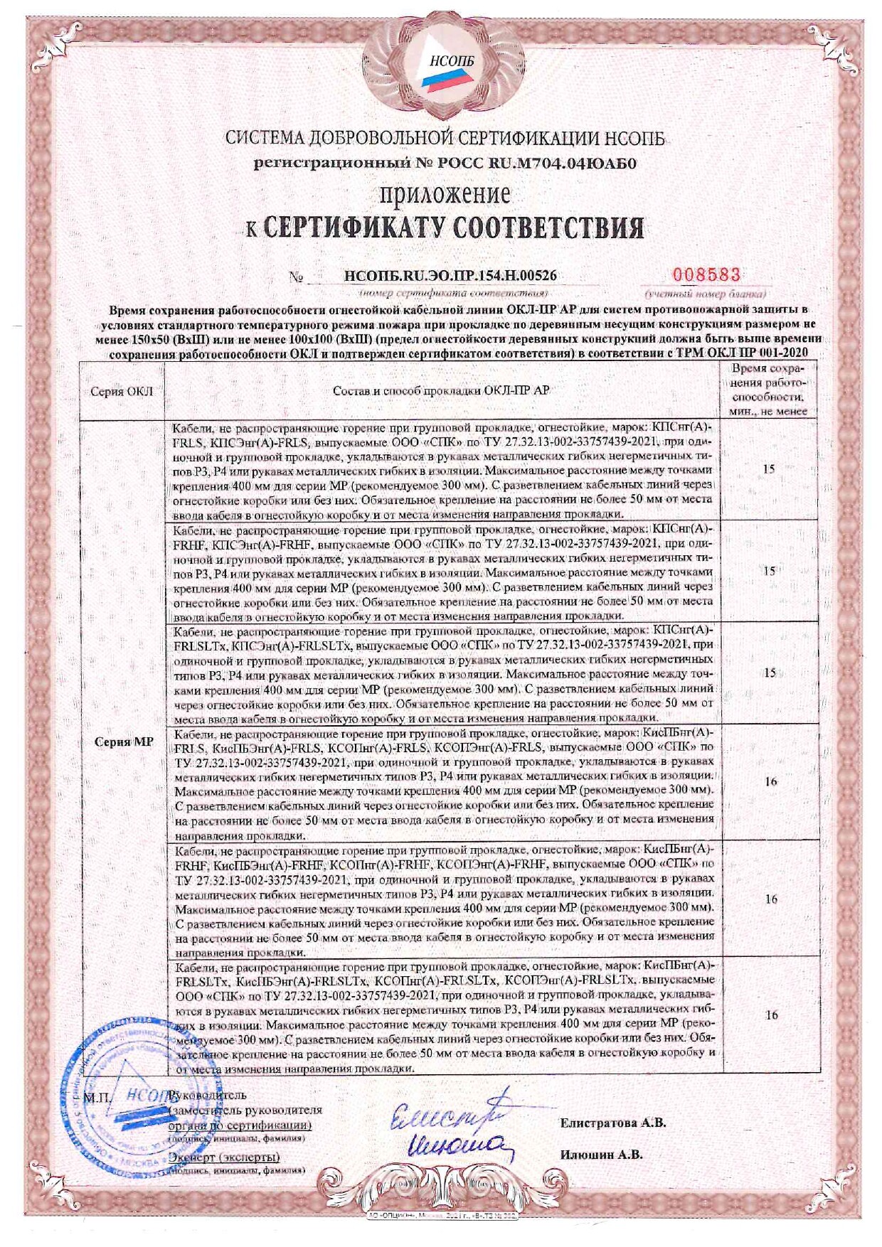 Время работоспособности ОКЛ-ПР АР подтверждается сертификатами соответствия, в соответствии с ГОСТ Р 53316-2009 «Кабельные линии. Сохранение работоспособности в условиях пожара. Методы испытания».