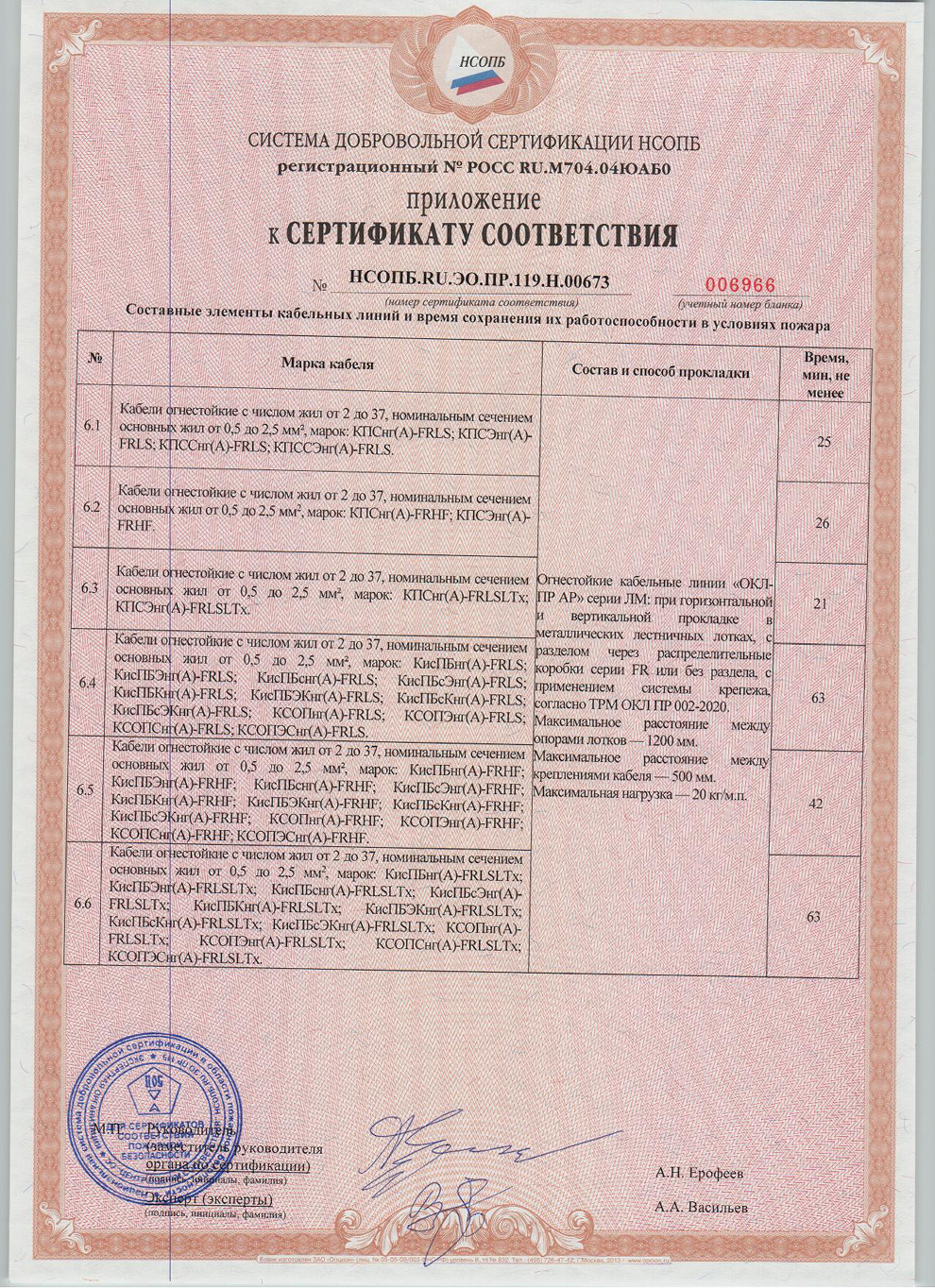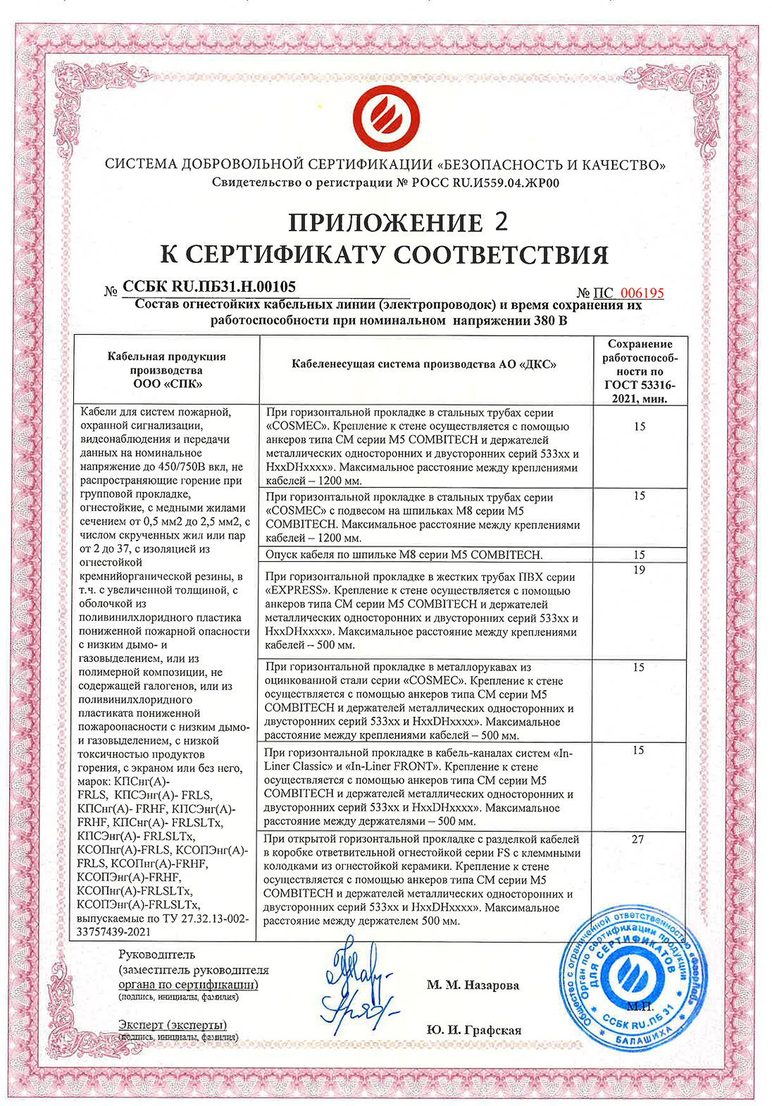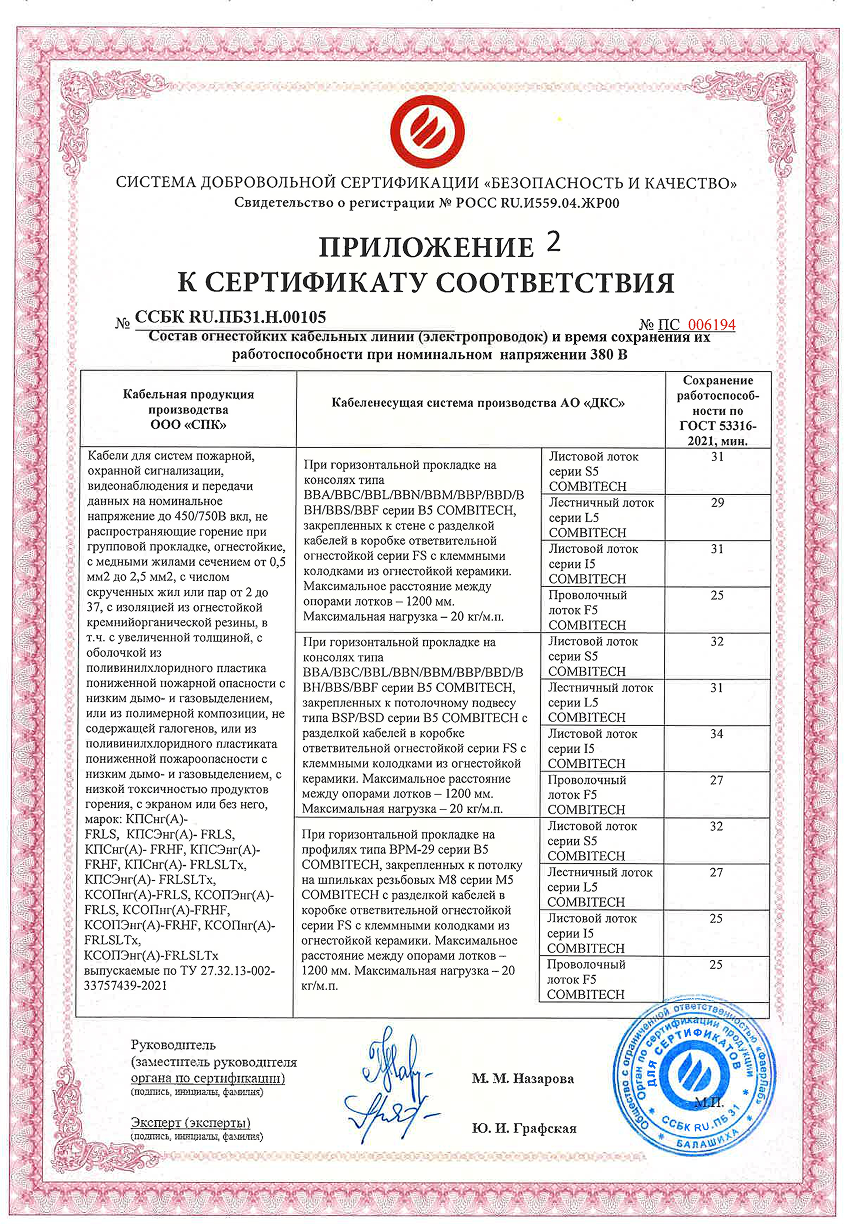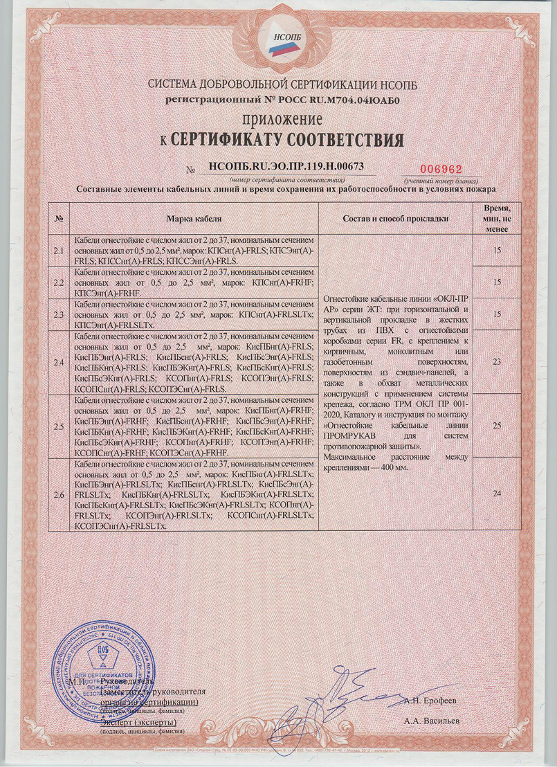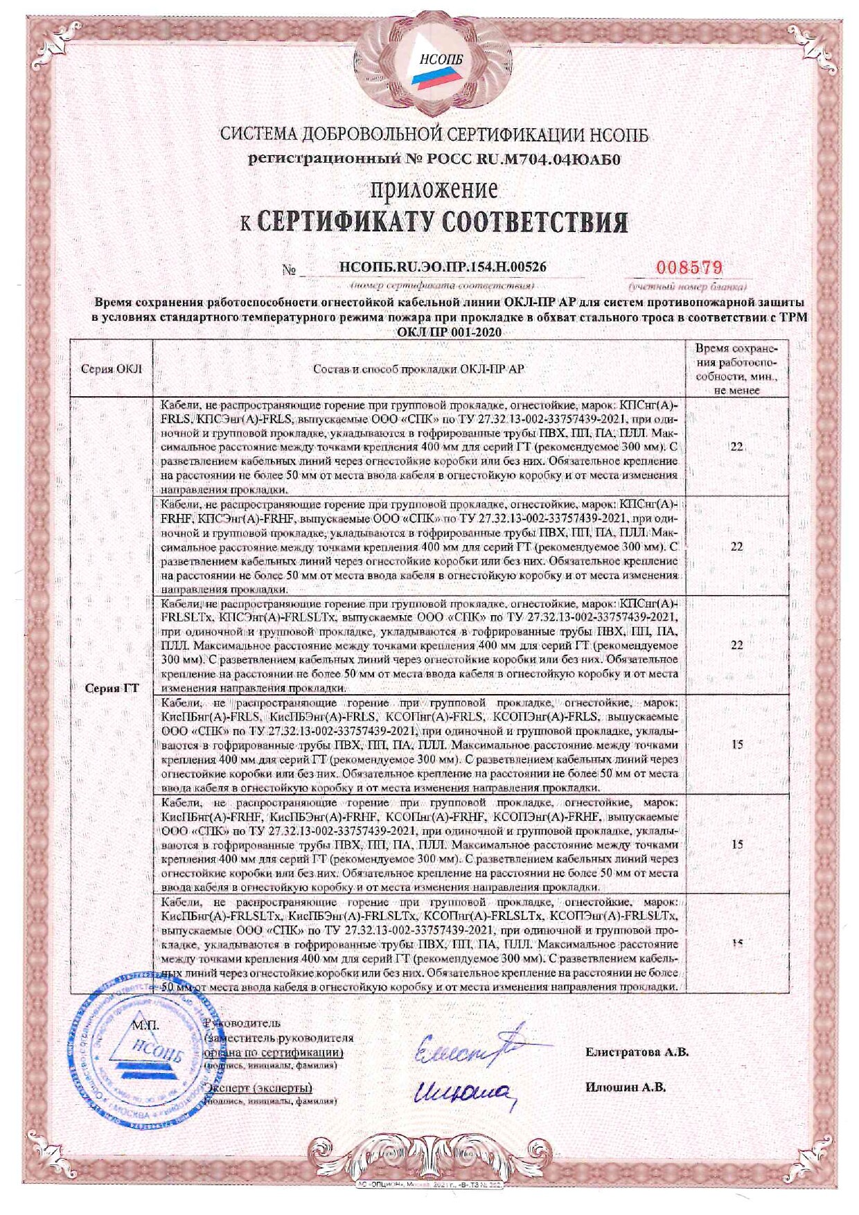 Время работоспособности ОКЛ-ПР АР подтверждается сертификатами соответствия, в соответствии с ГОСТ Р 53316-2009 «Кабельные линии. Сохранение работоспособности в условиях пожара. Методы испытания».