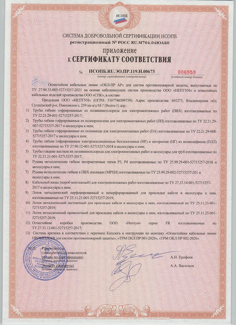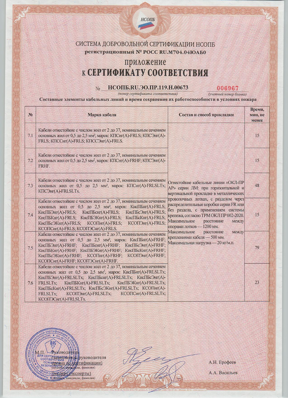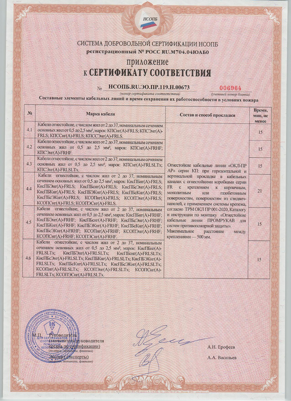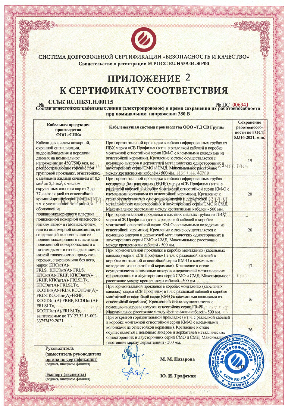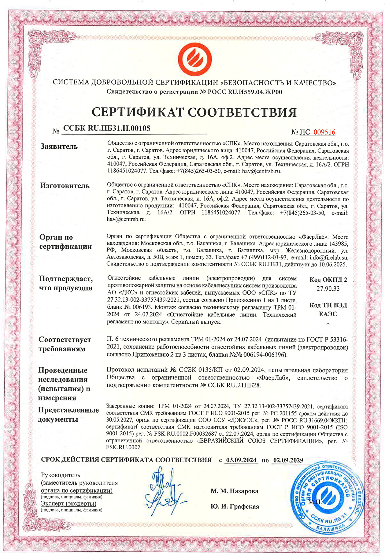 Время работоспособности ОКЛ-ПР АР подтверждается сертификатами соответствия, в соответствии с ГОСТ Р 53316-2009 «Кабельные линии. Сохранение работоспособности в условиях пожара. Методы испытания».