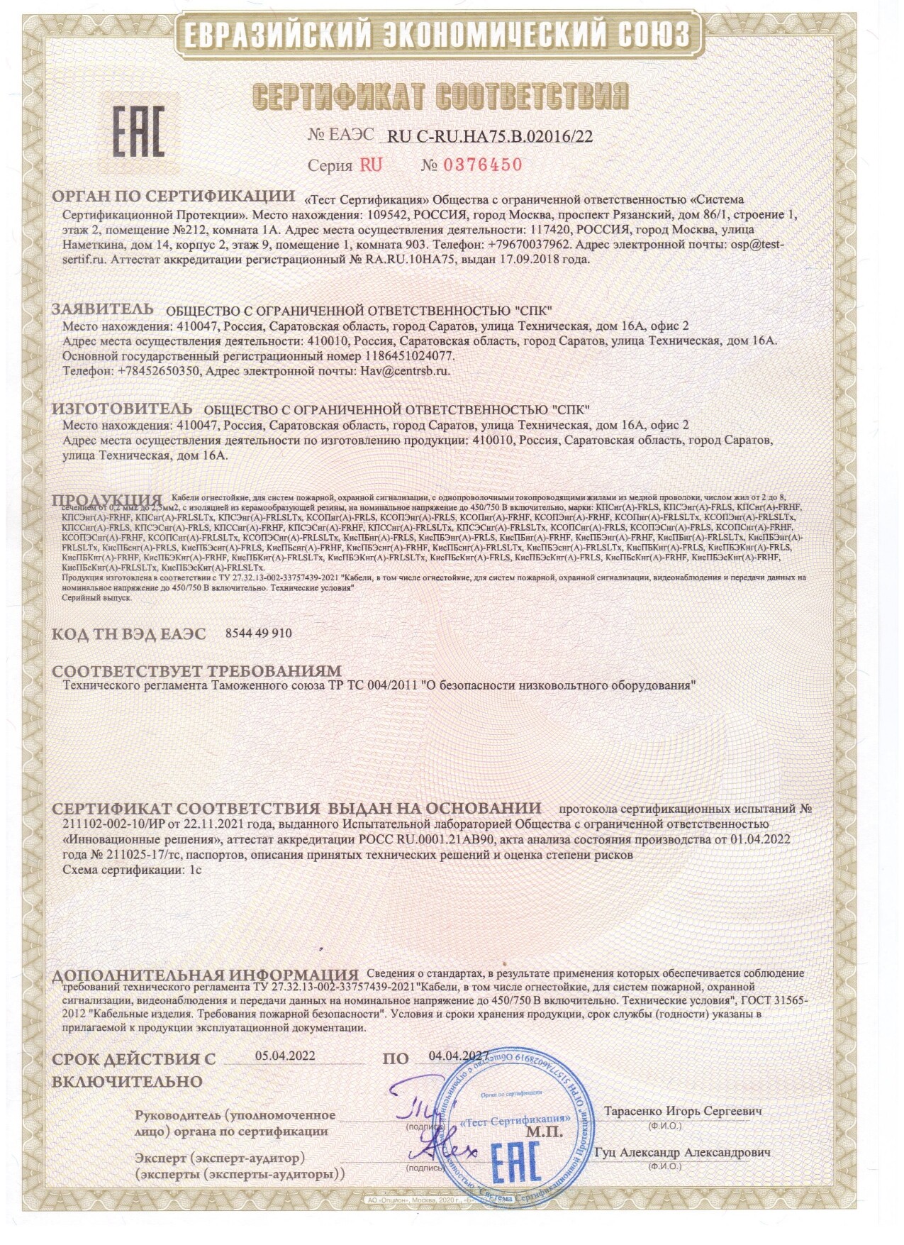 Кабель с однопроволочными токопроводящими жилами из медной проволоки, с изоляцией из керамообразующей резины, парной скрутки совместно с полиимидной пленкой, в оболочке из поливинилхлоридного пластиката пониженной пожароопасности с низким дымо- и газовыделением.