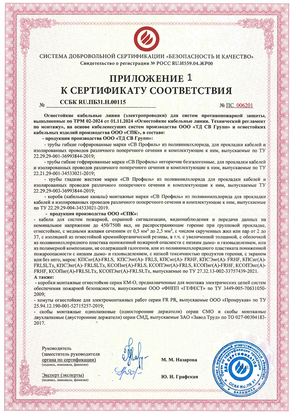 При горизонтальной прокладке в гибких гофрированных трубах негорючих безгалогенных (FRHF) марки «СВ Профиль» (в т.ч. с разделкой кабелей в коробке монтажной огнестойкой серии КМ-О с клеммными колодками из огнестойкой керамики). Крепление к стене осуществляется с помощью анкеров и держателей металлических односторонних и двусторонних серий СМО и СМД. Максимальное расстояние между креплениями кабелей - 500 мм.
